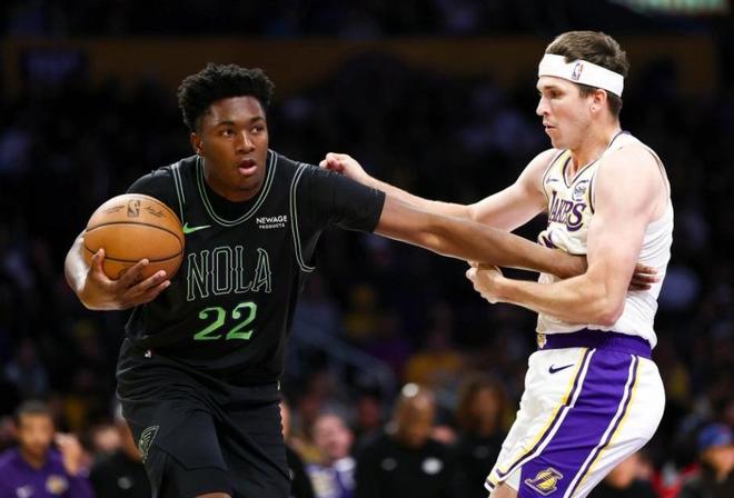 NBA常规赛,湖人主场迎击鹈鹕。本场比赛之前,湖人14胜4负排名西部第2,赛季初状态异常火热,51.4%的投篮命中率,排名联盟第一。东契奇和里夫斯二人组,进攻火力拉满,两人场均合砍63.6分,二人组得分上断层领跑联盟第一,詹姆斯都成角色球员了,当然对老詹来说也是好事,带队压力比以前小了很多,比赛也可以划划水了,保存体力就行。当然,这支湖人也并非没有短板,他们的防守和篮板球还是差一些,场均40.8的篮板,仅排名联盟倒数第四。另一边的鹈鹕队,本场比赛之前,3胜17负排名西部倒数第一。